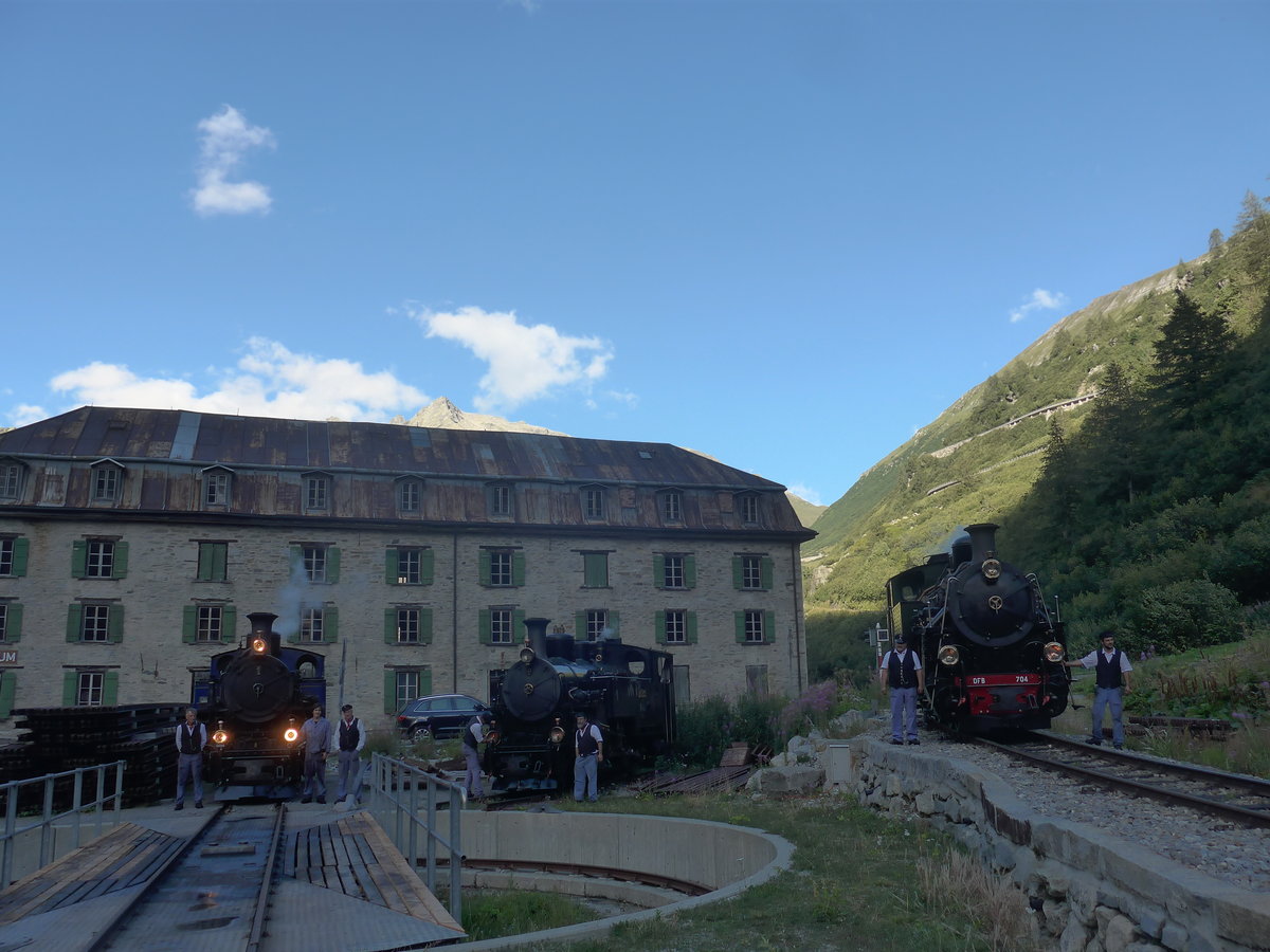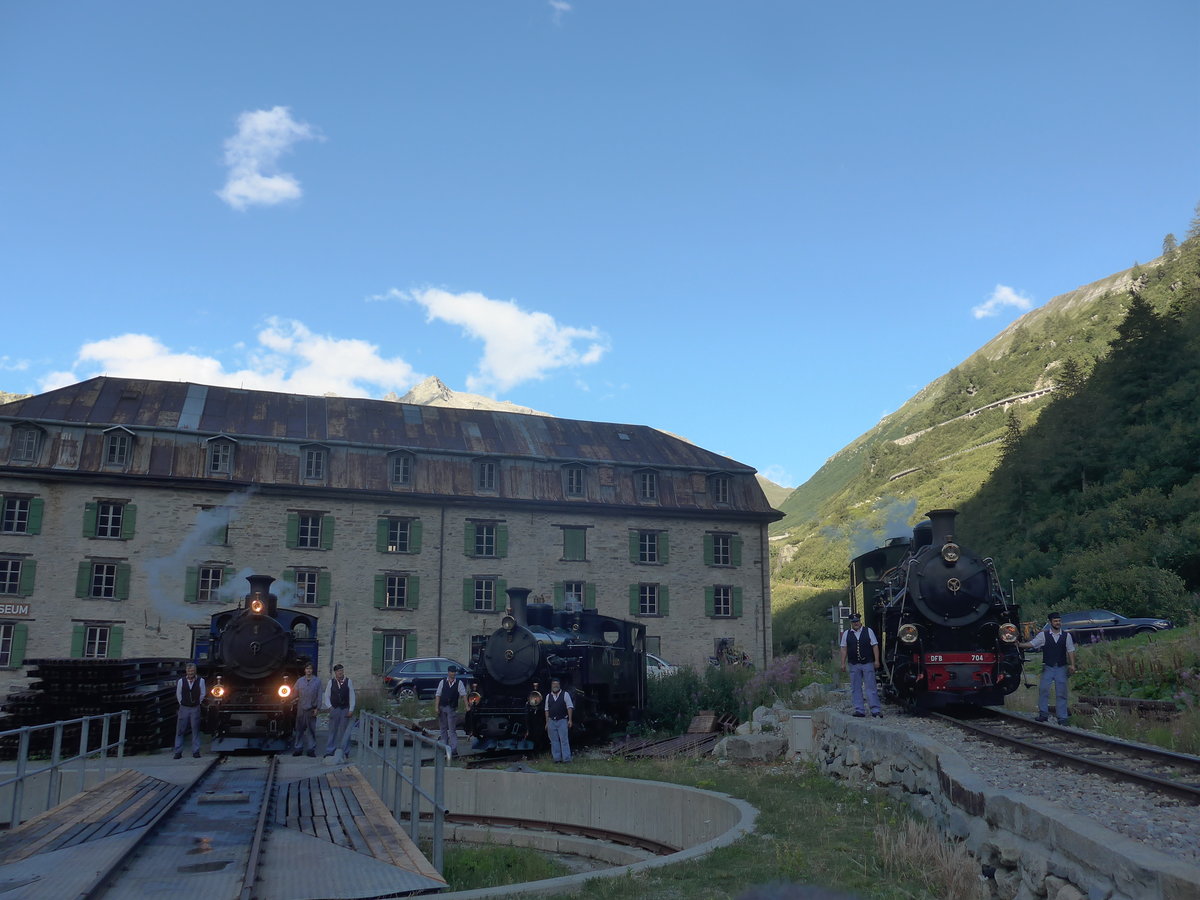 (220'017) - DFB-Dampflokomotiven - Nr. 1, 9 + 704 - mit Personal am 22. August 2020 in Gletsch