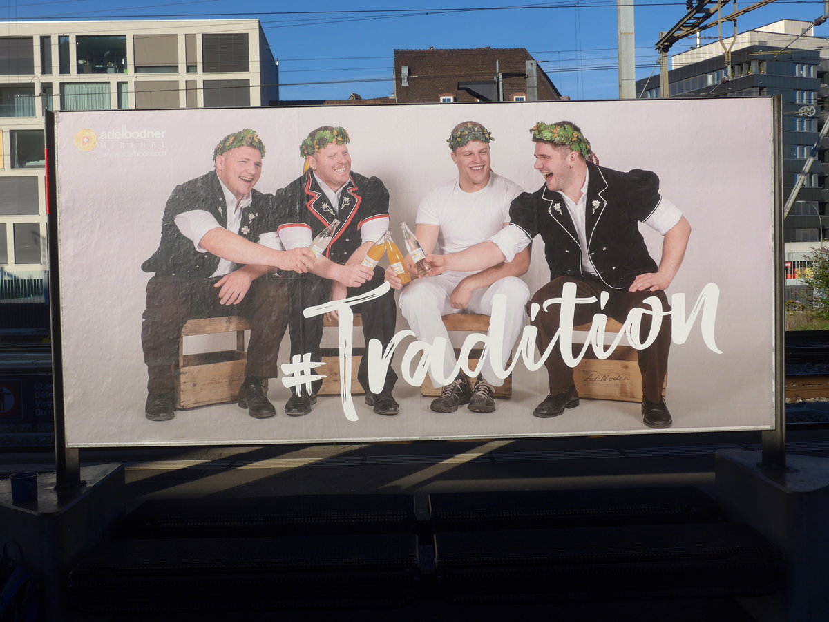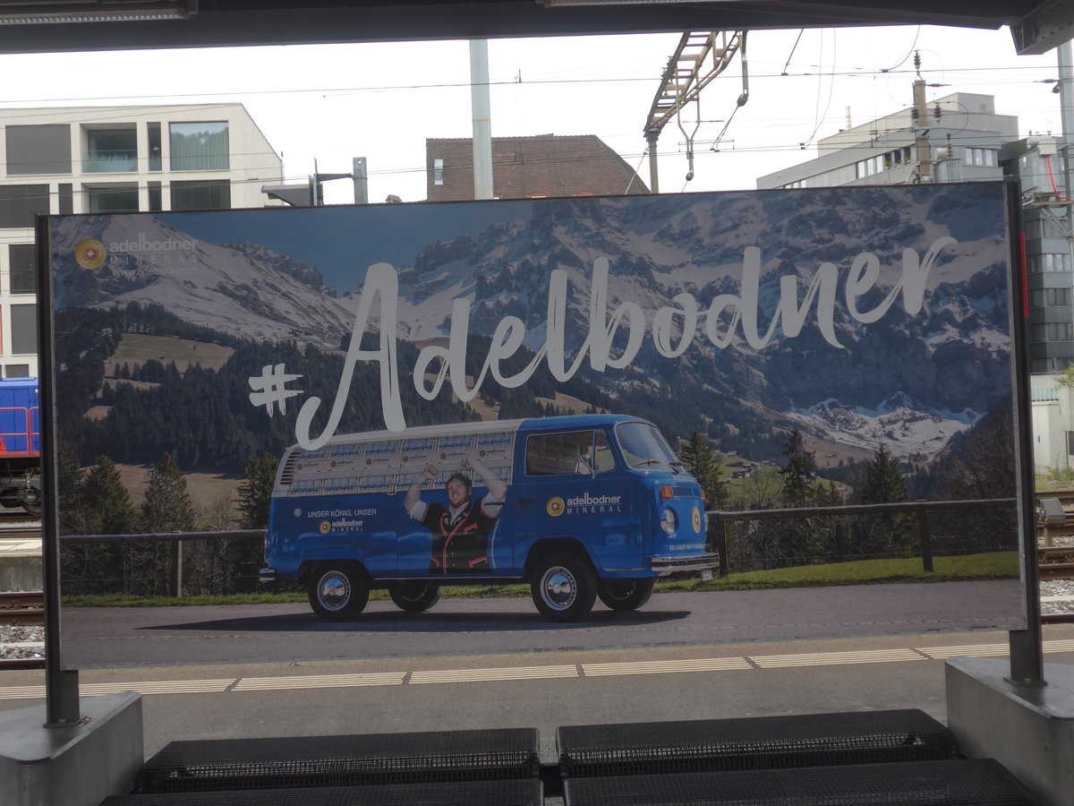 (220'021) - Adelbodner-Mineral-Plakat am 23. August 2020 im Bahnhof Thun