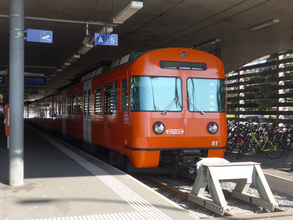 (208'403) - RBS-Pendelzug - Nr. 61 - am 4. August 2019 im Bahnhof Worb Dorf