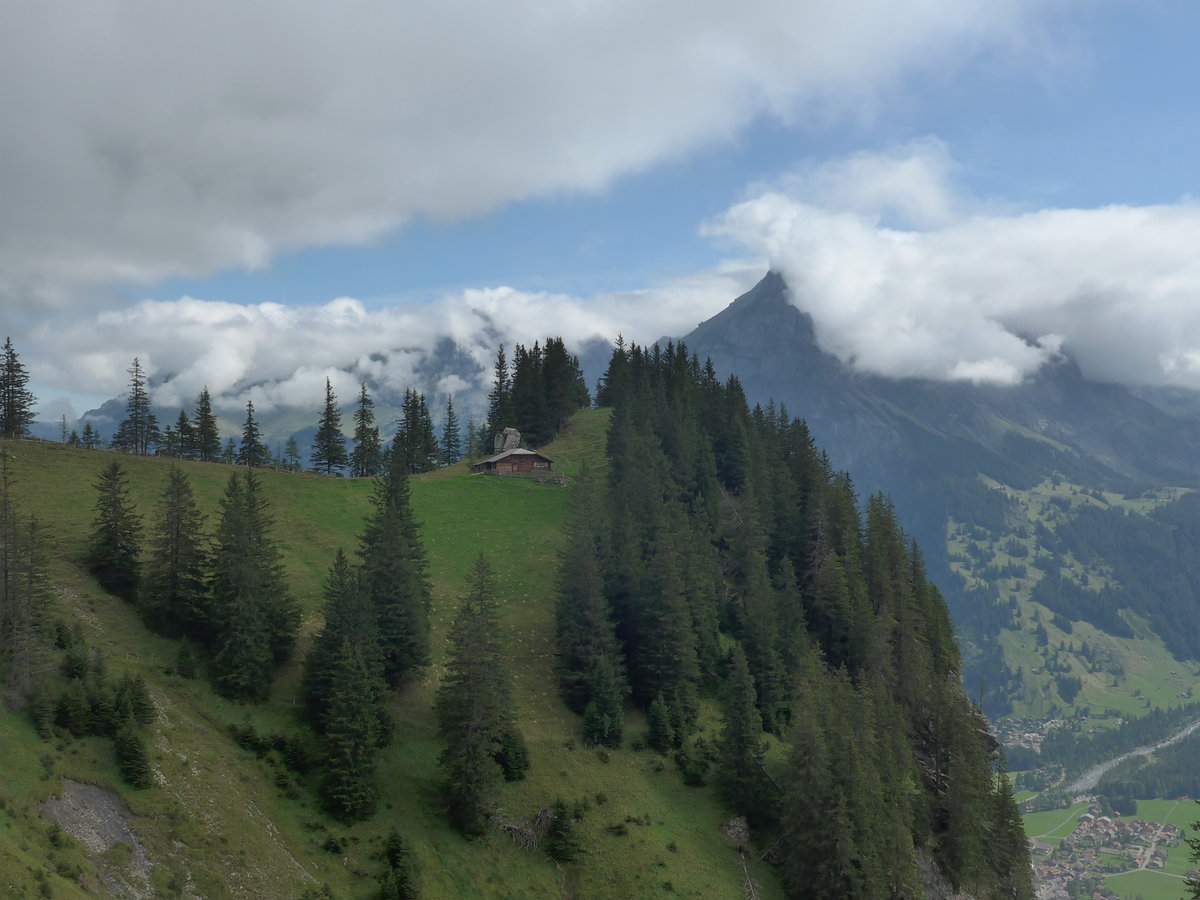 (195'960) - Alphütte und Tannen mit Blick auf Kandersteg am 18. August 2018 auf der Allmenalp bei Kandersteg