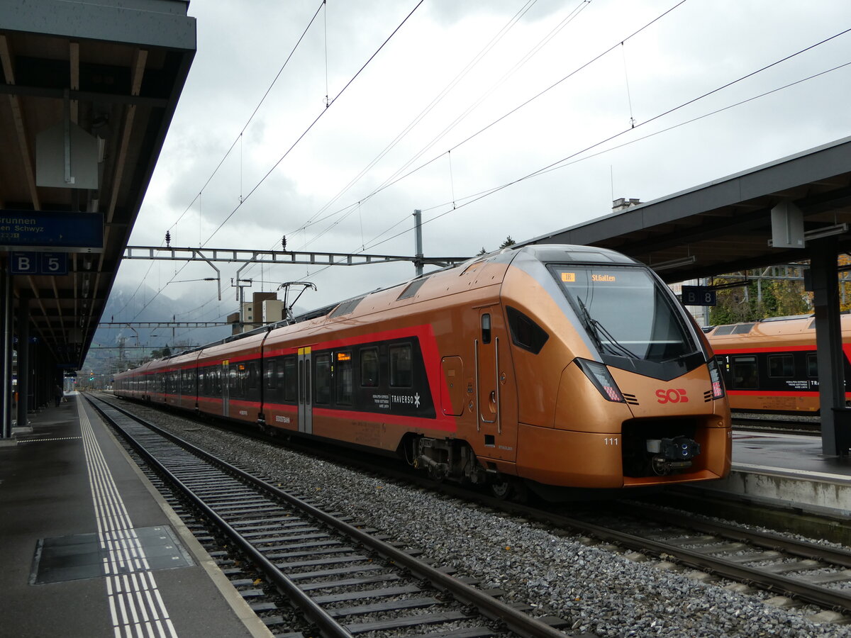 (242'980) - SOB-Pendelzug - Nr. 111 - am 18. November 2022 im Bahnhof Arth-Goldau