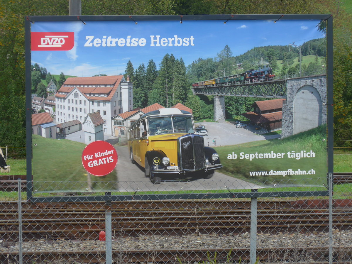 (221'862) - Plakat vom Dampfbahn Verein Zürcher Oberland (DVZO) am 12. Oktober 2020 im Bahnhof Bauma